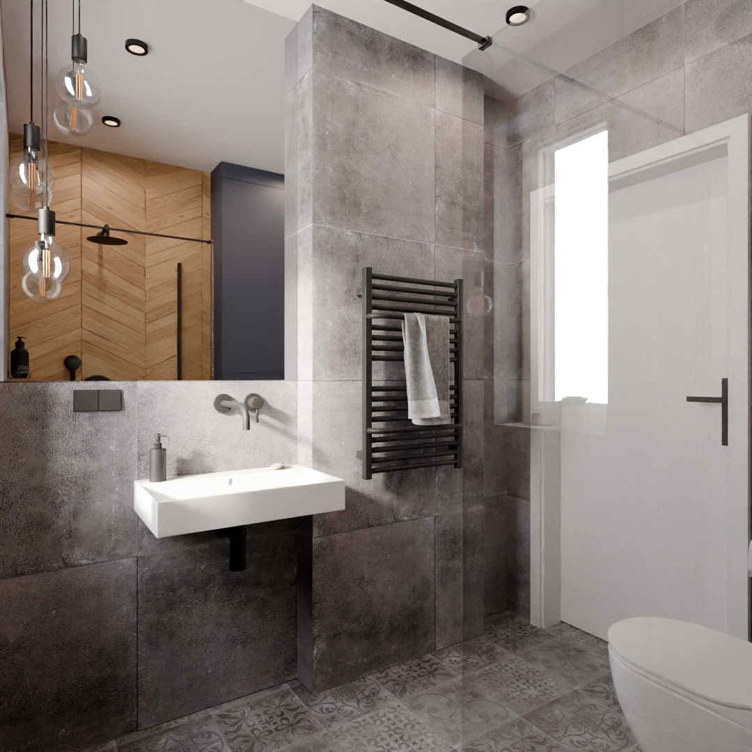 Projekt małej łazienki dowodzi Eksperckości w zakresie projektowania skomplikowanych, małych przestrzeni. Postawiliśmy na ciemny, industrialny charakter przełamany ciepłem drewna.