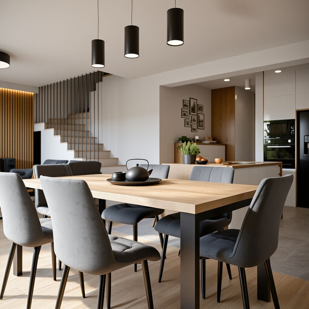 - Strefa Jadalni: Długi, drewniany stół z tapicerowanymi, szarymi krzesłami pełni funkcję idealną zarówno do codziennych posiłków, jak i przyjmowania gości.