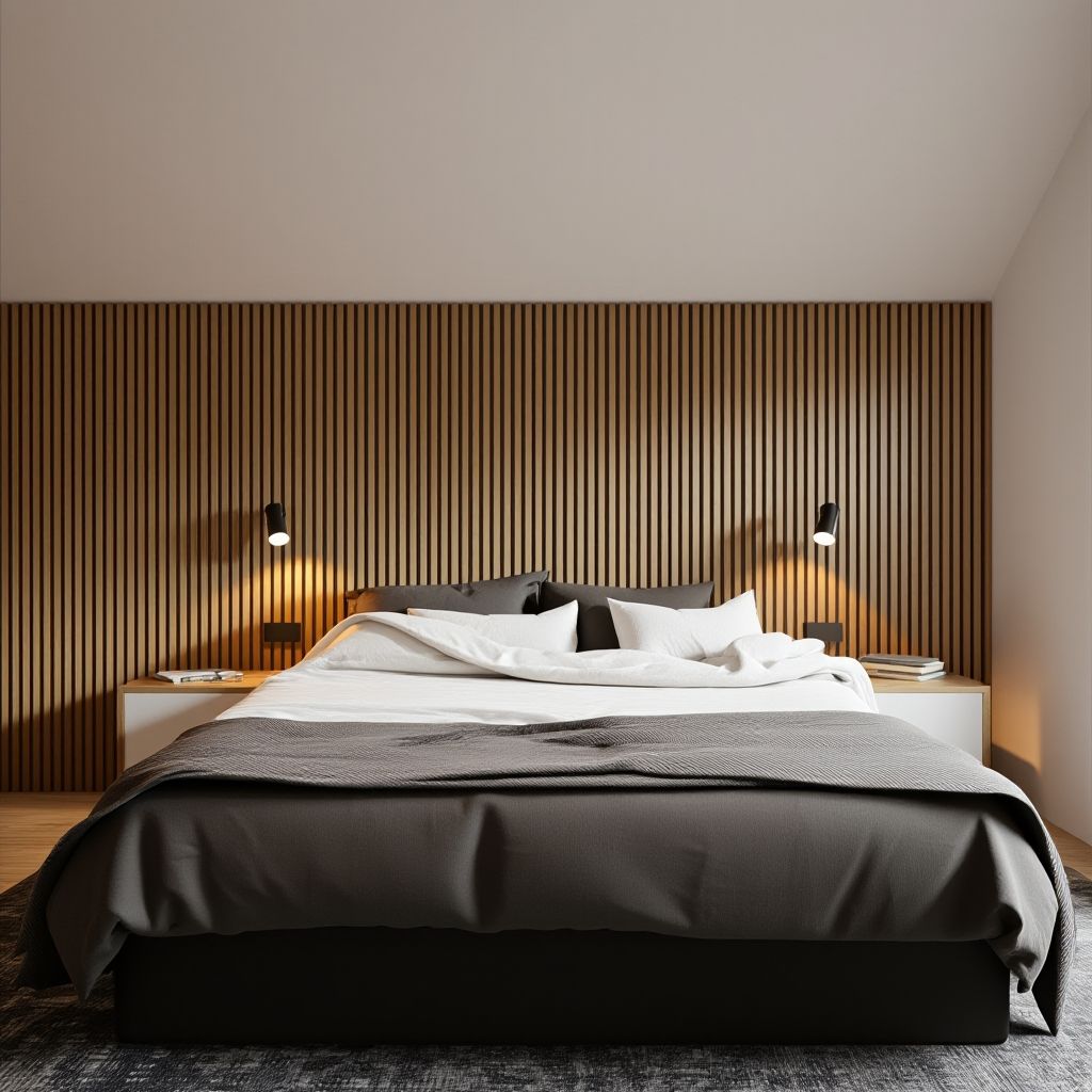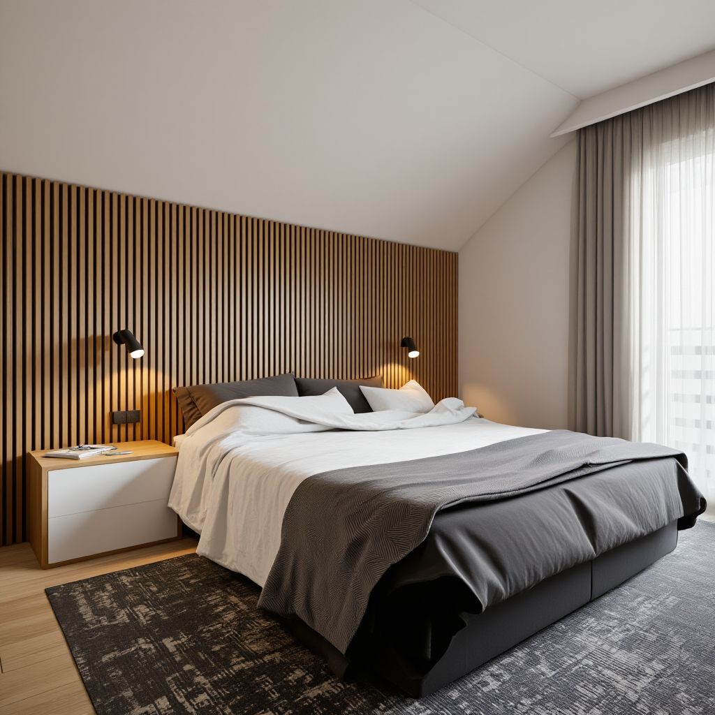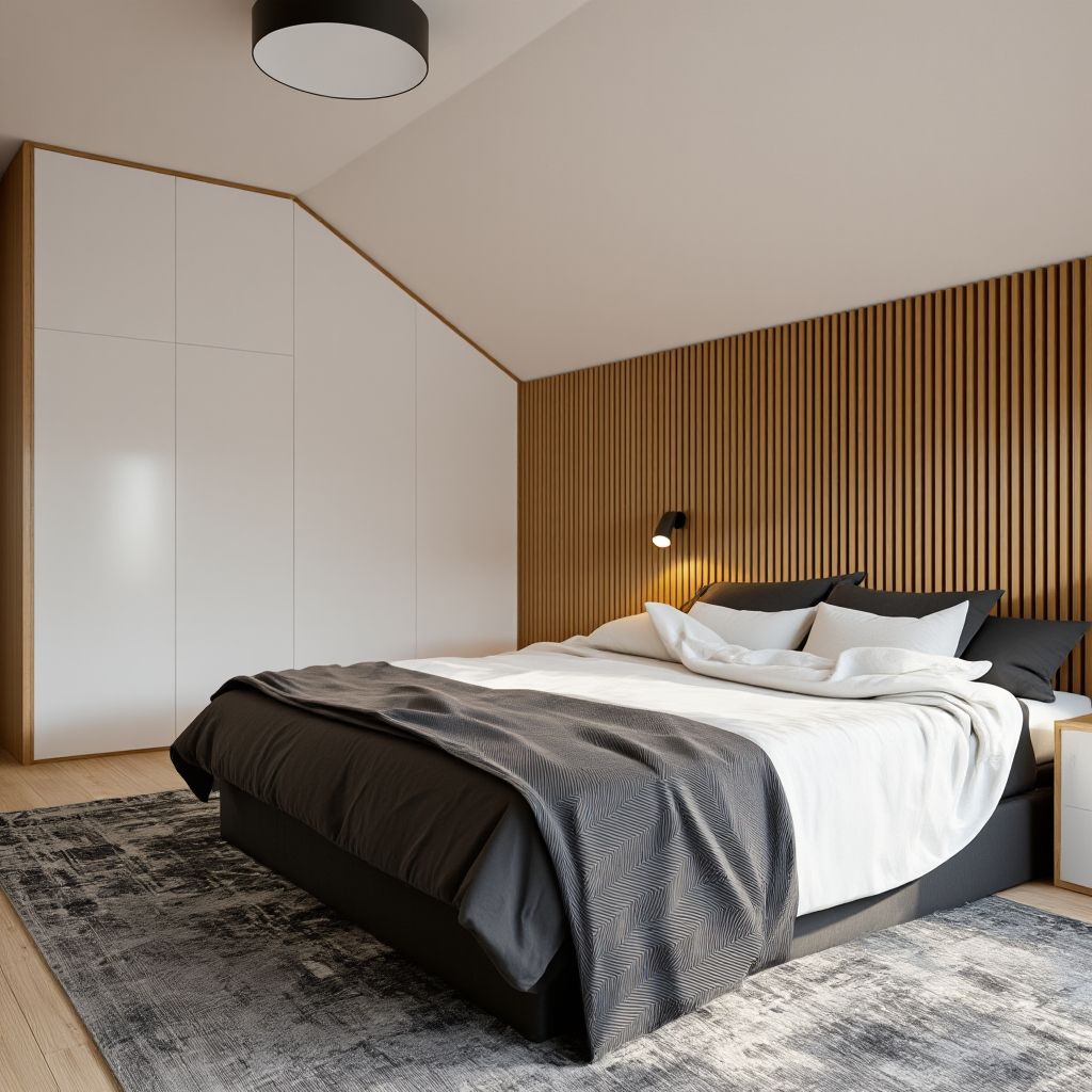 - Akcent Dekoracyjny: Ścianę za łóżkiem w całości pokrywa drewniana lamela dębowa, stanowiąca naturalny i ciepły zagłówek. Obok łóżka umieściliśmy minimalistyczne szafki nocne (częściowo drewniane, częściowo białe) oraz dyskretne, czarne oświetlenie do czytania.