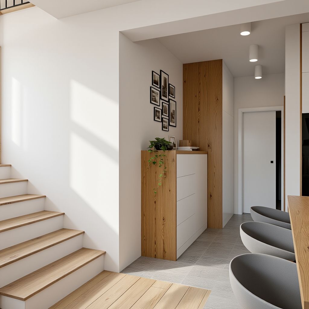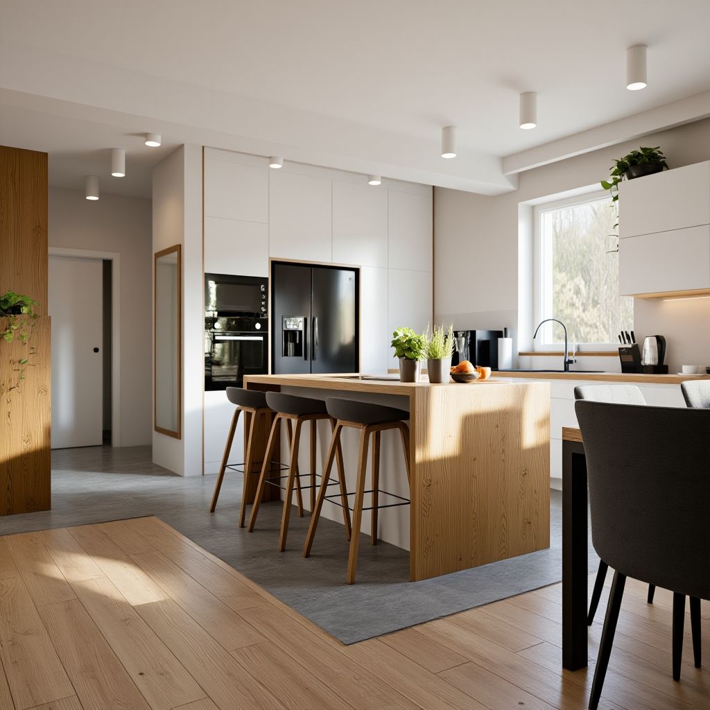 - Spójność Podłogi: Użycie drewnianej podłogi w salonie i jadalni oraz płytek w kolorze jasnego grafitu w strefie kuchni wyraźnie, ale płynnie dzieli pomieszczenia.