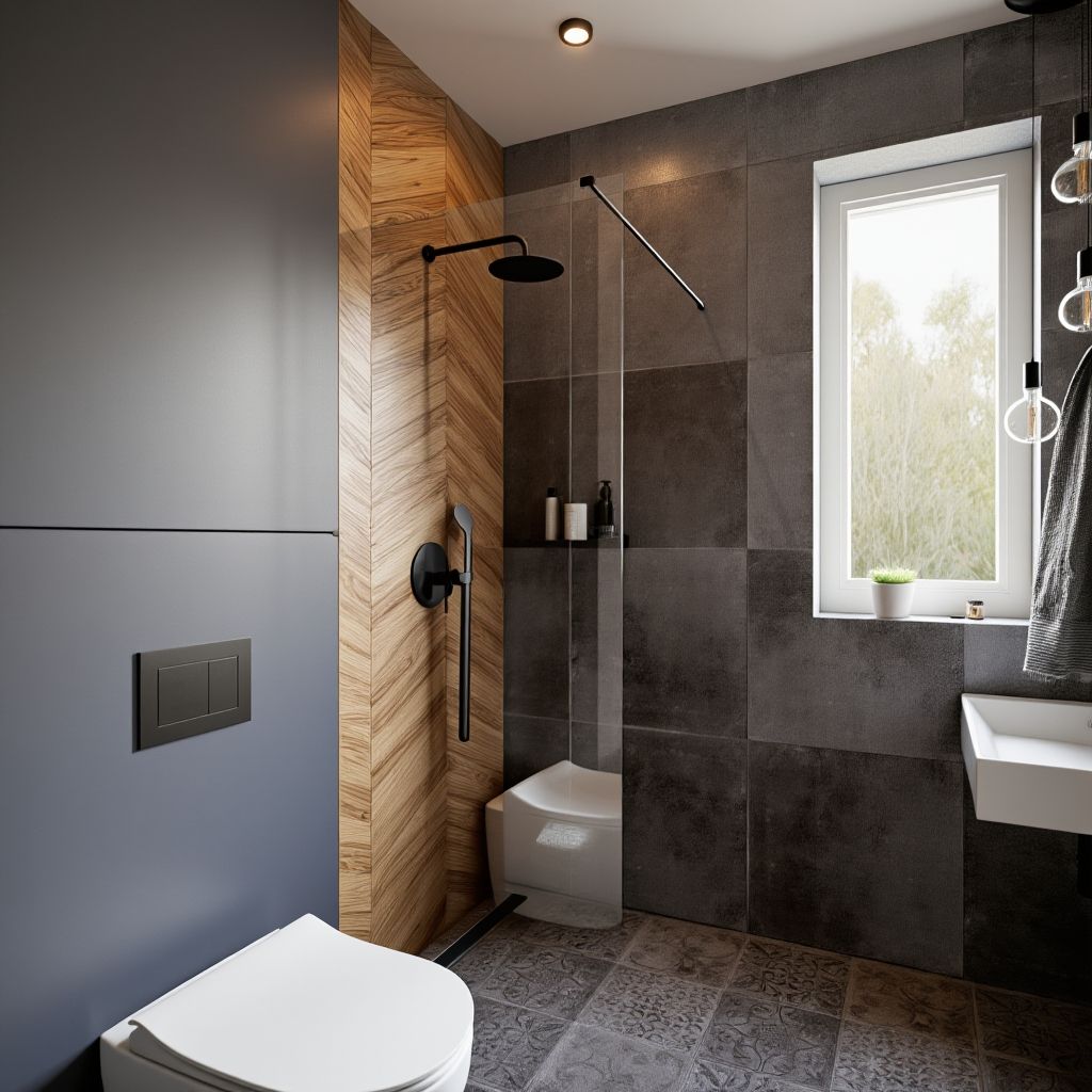 - Materiały Kontrastowe: Zastosowaliśmy płytki w kolorze ciemnoszarym na ścianach i podłodze. Kontrastuje z nimi efektowna drewnopodobna płytka w jodełkę w strefie prysznica.