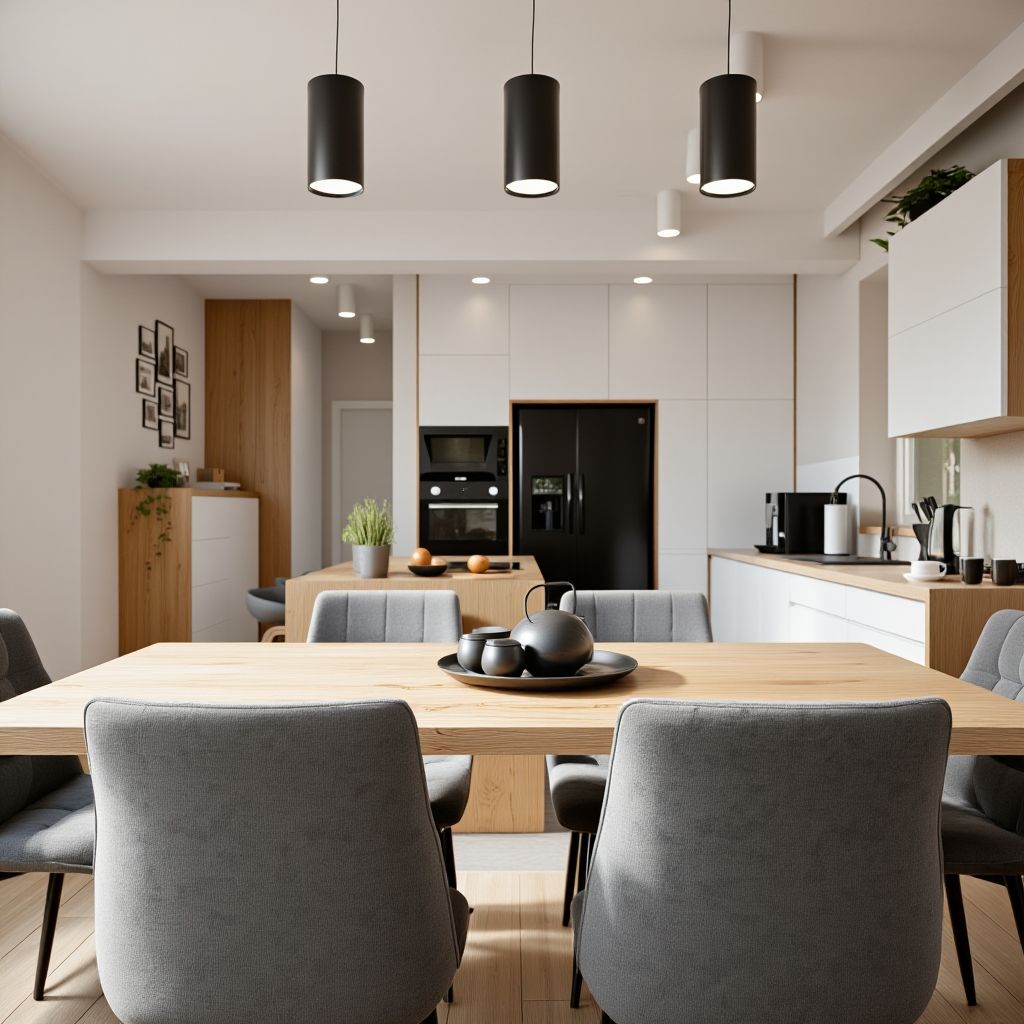 - Wydajne Oświetlenie: Zastosowaliśmy minimalistyczne tuby w suficie podwieszanym oraz czarne, wiszące lampy cylindryczne nad stołem jadalnianym, które doskonale doświetlają strefę konsumpcyjną.