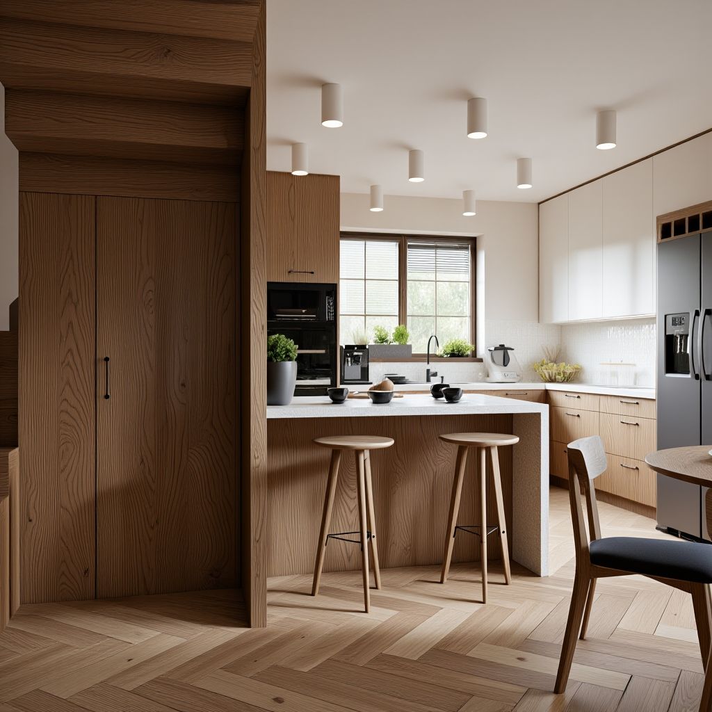 - Wysoka, fornirowana zabudowa w okolicach kuchni i schodów zapewnia spójność stylistyczną.