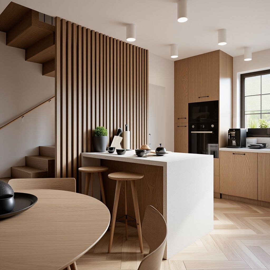 - Jadalnia: Jadalnia z okrągłym, drewnianym stołem jest umiejscowiona blisko wyspy kuchennej, co ułatwia interakcję.