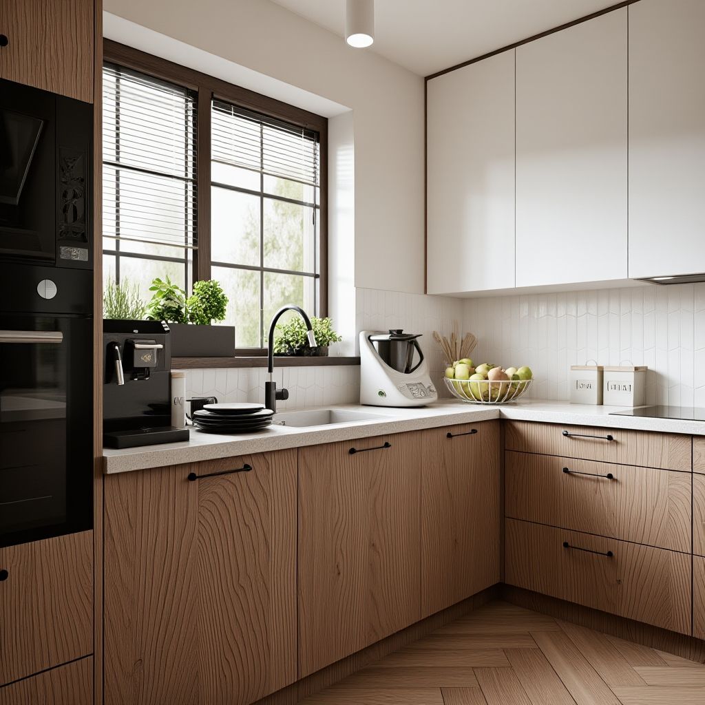 Cała koncepcja projektu opiera się na kontraście jasnej, minimalistycznej bazy (białe, gładkie fronty szafek, jasne ściany) oraz wyraźnego i naturalnego drewna (forniru dębowego), które ociepla wnętrze, wprowadzając akcent skandynawski i naturalny.