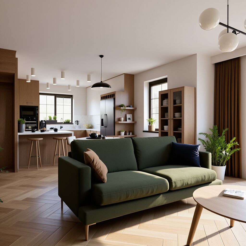 - Wypoczynek: Centralnym elementem jest duża sofa modułowa w kolorze głębokiej zieleni. Ten kolor, w połączeniu z brązowym fotelem i drewnianym stolikiem kawowym, tworzy ciepłą, relaksującą atmosferę.